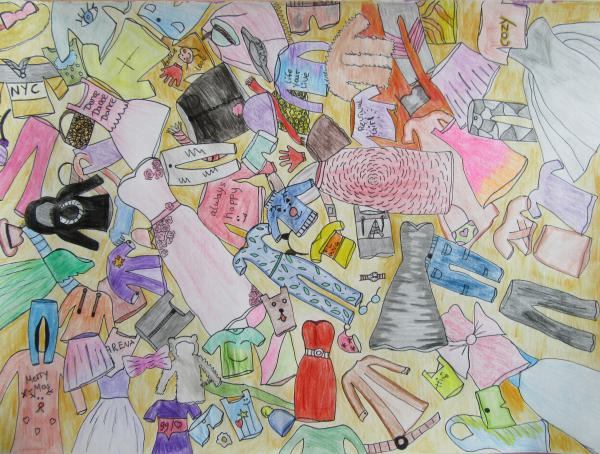 (6) Thema: Kleiderchaos - Buntstiftzeichnung